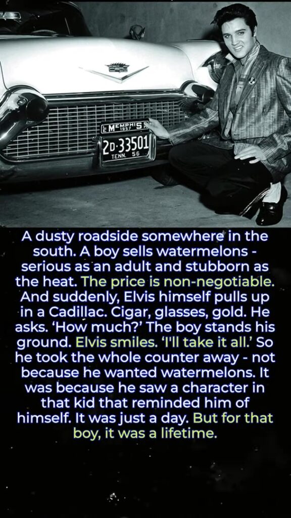 One hot southern afternoon, a young boy stood by the roadside selling watermelons. He was serious, stubborn, and proud—refusing to lower his price despite the heat and the slow sales. Then, a Cadillac pulled up. Out stepped Elvis Presley, dressed in gold, sunglasses, and a cigar. He asked, “How much?” The boy didn’t flinch. Elvis smiled and said, “I’ll take it all.”