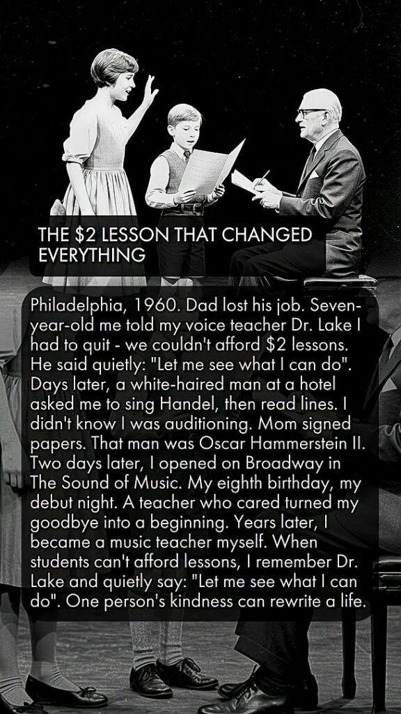 Two days later, the boy stepped onto a Broadway stage in The Sound of Music. It was his eighth birthday. That moment—sparked by a teacher’s quiet intervention—changed everything. Years later, the boy became a music teacher himself. And when his students couldn’t afford lessons, he remembered Dr. Lake’s words and said them again: “Let me see what I can do.”