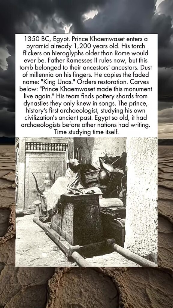 In 1350 BC, Prince Khaemwaset, son of Pharaoh Ramesses II, entered a pyramid already 1,200 years old. The tomb belonged to King Unas, a ruler from Egypt’s distant past. As dust settled on his fingers and torchlight flickered across faded hieroglyphs, Khaemwaset felt the weight of time. He ordered the tomb restored and carved a new inscription: “Prince Khaemwaset made this monument live again.”