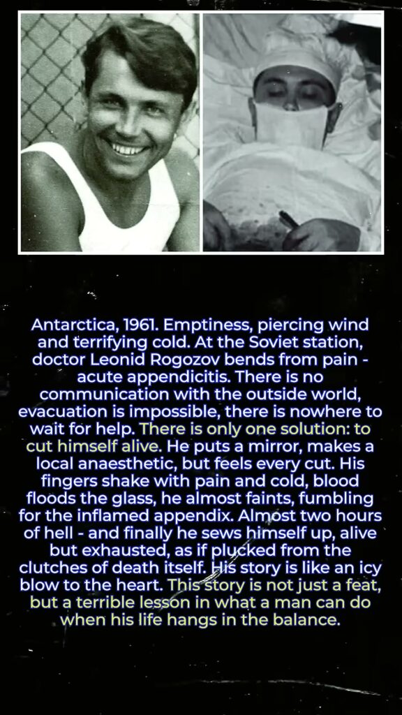 Antarctica, 1961. Amid blizzards and isolation, Soviet doctor Leonid Rogozov faced a deadly crisis: acute appendicitis. With no way to evacuate and no other medical personnel at the remote Novolazarevskaya Station, he had only one option—perform surgery on himself. Using a mirror, local anesthesia, and trembling hands, Rogozov made the first incision. Blood clouded his view, pain blurred his focus, and the cold gnawed at his strength. For nearly two hours, he battled death with scalpel and grit, locating and removing his inflamed appendix. Exhausted but alive, he stitched himself up, having defied the impossible. His act wasn’t just a medical miracle—it was a testament to human resilience. Rogozov’s story remains one of the most courageous and haunting examples of survival, reminding us that when life hangs by a thread, determination can become the scalpel that saves it.