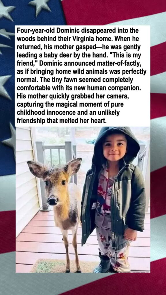 “Four-year-old Dominic disappeared into the woods behind their Virginia home. When he returned, his mother gasped—he was gently leading a baby deer by the hand. ‘This is my friend,’ Dominic announced matter-of-factly, as if bringing home wild animals was perfectly normal. The tiny fawn seemed completely comfortable with its new human companion. His mother quickly grabbed her camera, capturing the magical moment of pure childhood innocence and an unlikely friendship that melted her heart.”