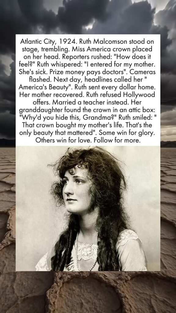 “Atlantic City, 1924. Ruth Malcomson stood on stage, trembling. Miss America crown placed on her head. Reporters rushed: ‘How does it feel?’ Ruth whispered: ‘I entered for my mother. She’s sick. Prize money pays doctors’. Cameras flashed. Next day, headlines called her ‘America’s Beauty’. Ruth sent crown directly home. Her mother recovered. Ruth refused Hollywood offers. Married a teacher instead. Her granddaughter found the crown in an attic box: ‘Why’d you hide this, Grandma?’ Ruth smiled: ‘That crown bought my mother’s life. That’s the only beauty that mattered’. Some win for glory. Others win for love. Follow love more.”