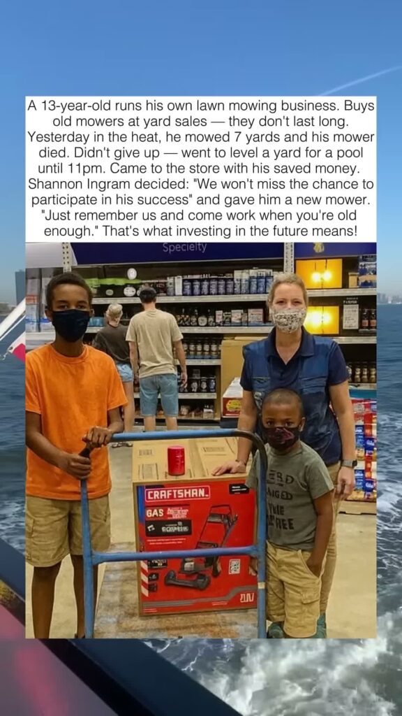 “A 13-year-old runs his own lawn mowing business. Buys old mowers at yard sales — they don’t last long. Yesterday in the heat, he mowed 7 yards and his mower died. Didn’t give up — went to level a yard for a pool until 11pm. Came to the store with his saved money. Shannon Ingram decided: ‘We won’t miss the chance to participate in his success’ and gave him a new mower. ‘Just remember us and come work when you’re old enough.’ That’s what investing in the future means!”