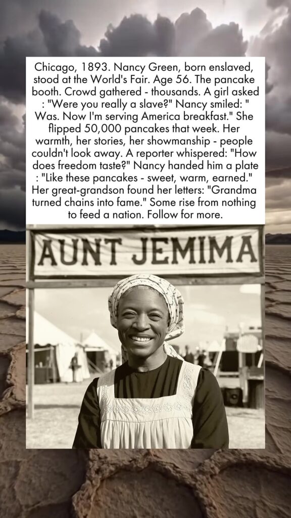 “Chicago, 1893. Nancy Green, born enslaved, stood at the World’s Fair. Age 56. The pancake booth. Crowd gathered – thousands. A girl asked ‘Were you really a slave?’ Nancy smiled. ‘Was. Now I’m serving American breakfast.’ She flipped 50,000 pancakes that week. Her warmth, her stories, her showmanship – people couldn’t look away. A reporter whispered: ‘How does freedom taste?’ Nancy handed him a plate: ‘Like these pancakes – sweet, warm, earned.’ Her great-grandson found her letters: ‘Grandma turned chains into fame.’ Some rise from nothing to feed a nation. Follow for more.”