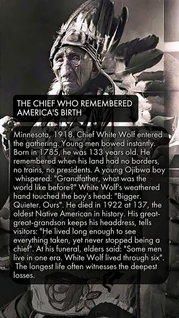 THE CHIEF WHO REMEMBERED AMERICA’S BIRTH Minnesota, 1918. Chief White Wolf entered the gathering. Young men looked intently. Born in 1785, he was 133 years old. He remembered when his land had no borders, no trains, no presidents. A young Ojibwa boy whispered: “Grandfather, what was the world like before?” White Wolf’s weathered hand touched the boy’s head: “Bigger. Quieter. Ours.” He died in 1922 at 137, the oldest Native American in history. His great-great-grandson keeps his headdresses, tells visitors: “He lived long enough to see everything taken, yet never stopped being a chief.” At his funeral, elders said: “Some men live long lives. White Wolf lived through such time.” The longest life often witnesses the deepest losses.