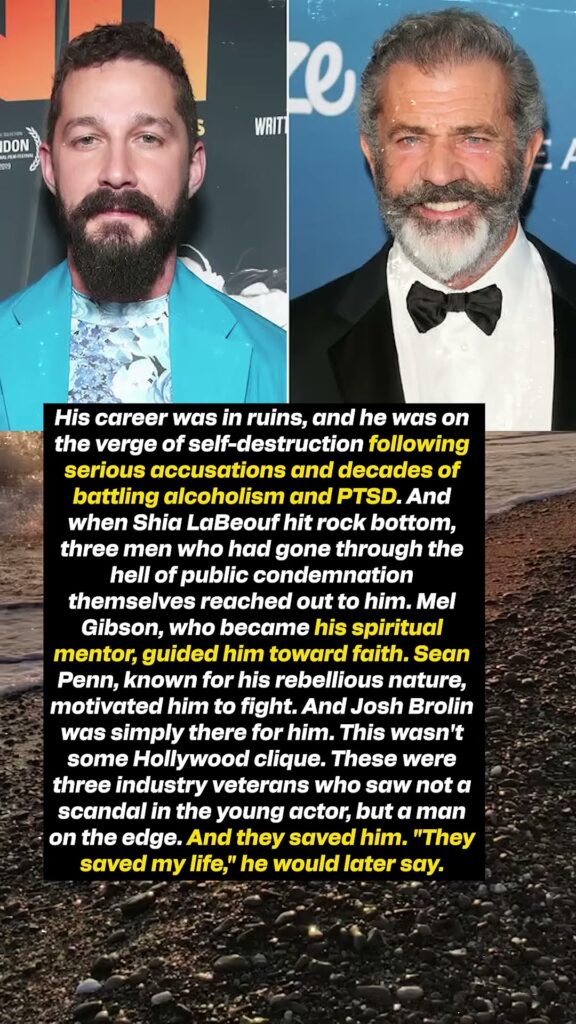 “His career was in ruins, and he was on the verge of self-destruction following serious accusations and decades of battling alcoholism and PTSD. And when Shia LaBeouf hit rock bottom, three men who had once been through the hell of public condemnation themselves reached out to him. Mel Gibson, who became his spiritual mentor, guided him toward faith. Sean Penn, known for his rebellious nature, motivated him to fight. And Josh Brolin was simply there to listen. These were three industry veterans who saw not a scandal in the young actor, but a man on the edge. And they saved him. ‘They saved my life,’ he would later say.”