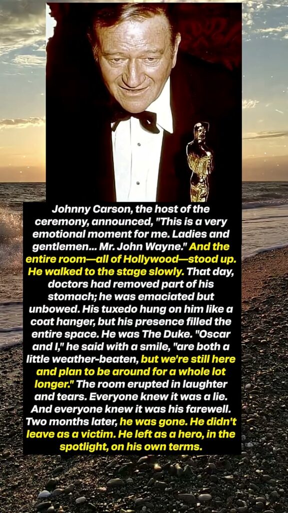 “Johnny Carson, the host of the ceremony, announced, ‘This is a very emotional moment for me. Ladies and gentlemen… Mr. John Wayne.’ And the entire room—all of Hollywood—stood up. He walked to the stage slowly. That day, doctors had removed part of his stomach due to his sickness. But he was determined to be there. He was emaciated, but he smiled the entire speech. He was The Duke. ‘Oscar and I,’ he said with a smile, ‘are both a little weather-beaten, but we’re still here and plan to be around for a whole lot longer.’ The room erupted in laughter and tears. Everyone knew it was his farewell. Two months later, he was gone. He didn’t leave as a victim. He left as a hero, in the spotlight, on his own terms.”