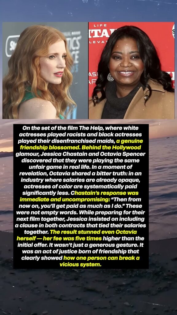 “On the set of the film The Help, white actresses played racists and Black actresses played their disenfranchised maids, a genuine friendship blossomed. Beneath the Hollywood glamour, Jessica Chastain and Octavia Spencer discovered that they were playing the same unfair game in real life. In a moment of revelation, Octavia shared a bitter truth: in an industry where salaries are closely guarded secrets, women of color are systematically paid significantly less. Chastain’s response was immediate and uncompromising: ‘Then from now on, you’ll get paid as much as I do.’ These were not empty words. When they later worked together on another project, Chastain included a clause in both contracts that tied their salaries to each other. The result stunned even Octavia Spencer: her fee was five times more than she was used to. It wasn’t just a generous gesture. It was an act of justice born of friendship that clearly showed how one person can break a vicious system.”