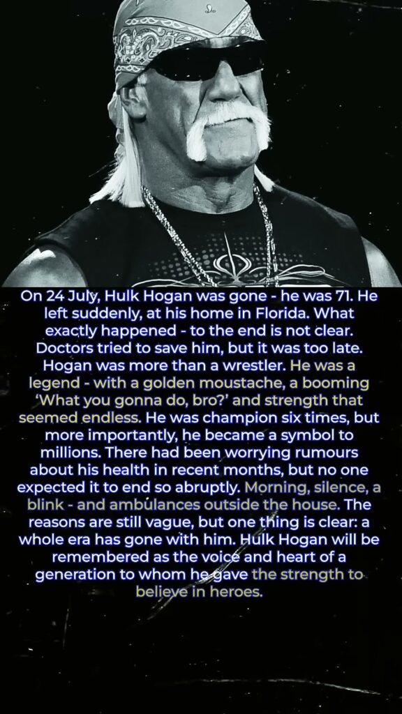 “On 24 July, Hulk Hogan was gone – he was 71. He left suddenly, at his home in Florida. What exactly happened to him is not clear. Doctors tried to save him, but it was too late. Hogan was more than a wrestler. He was a legend – with a golden moustache, a booming “What you gonna do, bro?” and strength that seemed endless. He was a champion six times, but more importantly, he became a symbol to millions. There had been worrying rumours about his health in recent months, but no one expected it to end so abruptly. Morning, silence, a blink – and ambulances outside the house. The reasons are still vague, but one thing is clear: a whole era has gone with him. Hulk Hogan will be remembered as the voice and heart of a generation to whom he gave the strength to believe in heroes.”