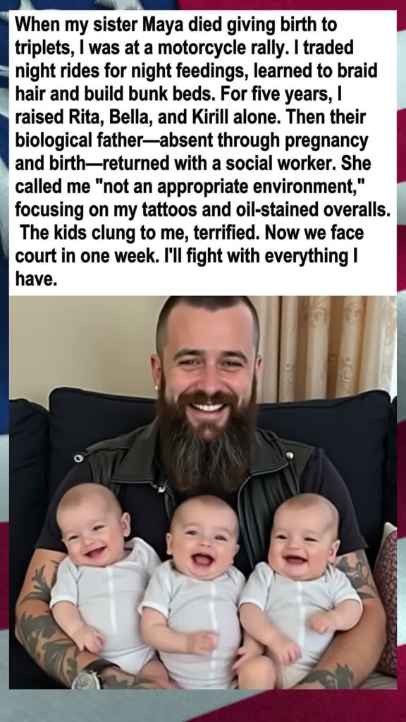 “When my sister Maya died giving birth to triplets, I was at a motorcycle rally. I traded night rides for night feedings, learned to braid hair and build bunk beds. For five years, I raised Rita, Bella, and Kirill alone. Then their biological father—absent through pregnancy and birth—returned with a social worker. She called me ‘not an appropriate environment,’ focusing on my tattoos and oil-stained overalls. The kids clung to me, terrified. Now we face court in one week. I’ll fight with everything I have.”