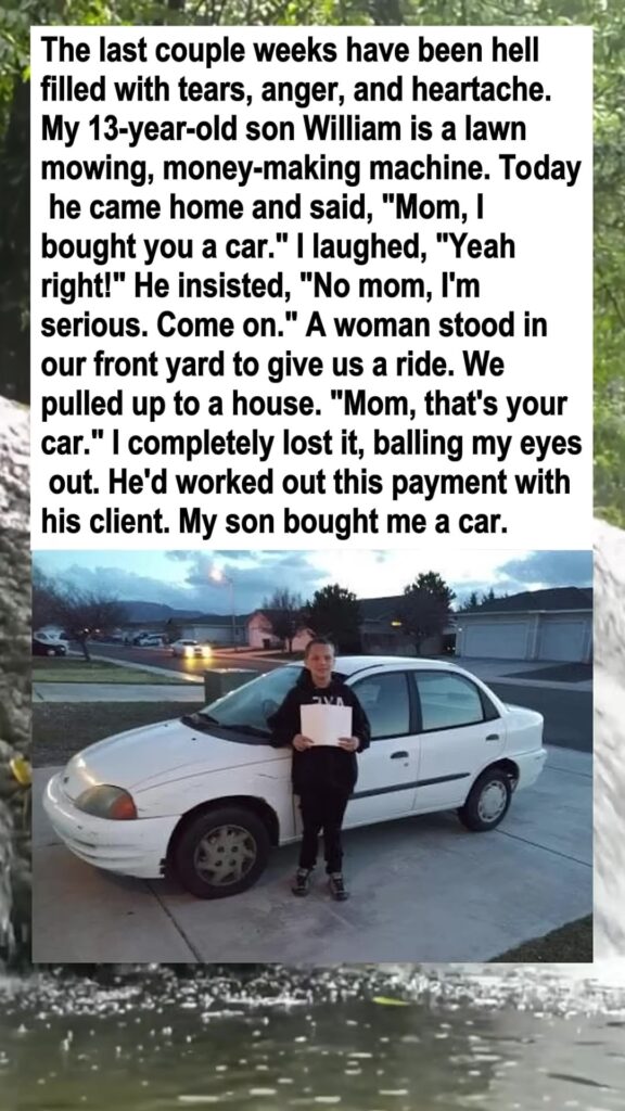 “The last couple weeks have been hell filled with tears, anger, and heartache. My 13-year-old son William is a lawn mowing, money-making machine. Today he came home and said, ‘Mom, I bought you a car.’ I laughed, ‘Yeah right!’ He insisted, ‘No mom, I’m serious. Come on.’ A woman stood in our front yard to give us a ride. We pulled up to a house. ‘Mom, that’s your car.’ I completely lost it, balling my eyes out. He’d worked out this payment with his client. My son bought me a car.”