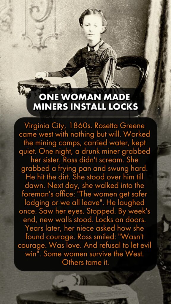 Virginia City, 1860s. Rosetta Greene came west with nothing but will. Worked the mining camps, carried water, kept quiet. One night, a drunk miner grabbed her sister. Ross didn’t scream. She grabbed a frying pan and swung hard. He hit the dirt. She stood over him till dawn.