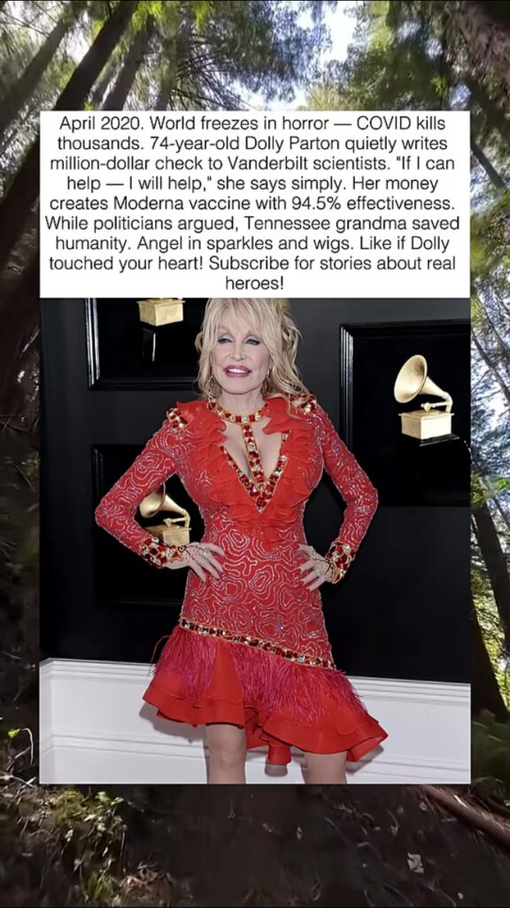 “April 2020. World freezes in horror — COVID kills thousands. 74-year-old Dolly Parton quietly writes million-dollar check to Vanderbilt scientists. ‘If I can help — I will help,’ she says simply. Her money creates Moderna vaccine with 94.5% effectiveness. While politicians argued, Tennessee grandma saved humanity. Angel in sparkles and wings. Like if Dolly touched your heart! Subscribe for stories about real heroes!”