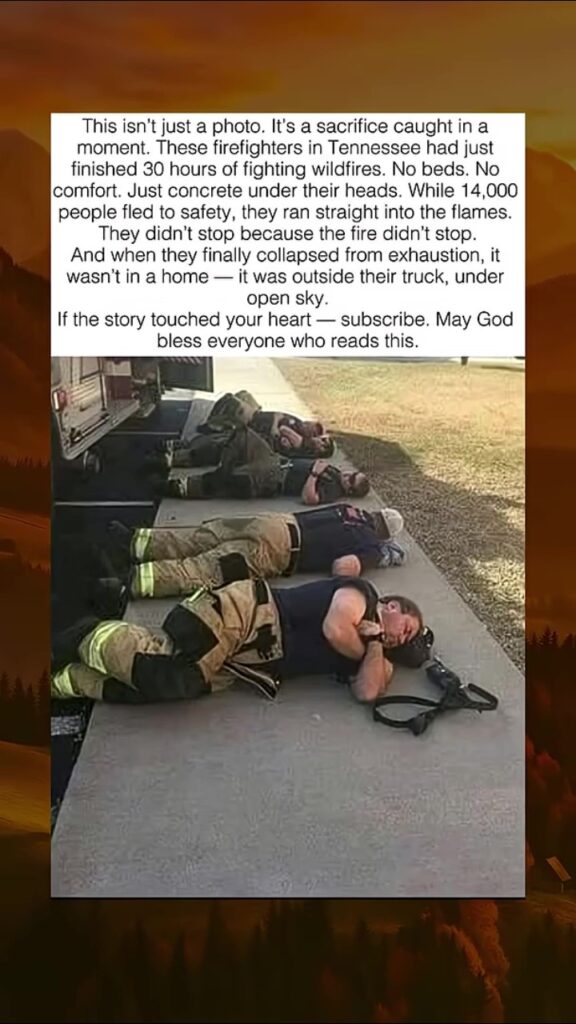 “This isn’t just a photo. It’s a sacrifice caught in a moment. These firefighters in Tennessee had just finished 30 hours of fighting wildfires. No beds. No comfort. Just concrete under their heads. While 14,000 people fled to safety, they ran straight into the flames. They didn’t stop because the fire didn’t stop. And when they finally collapsed from exhaustion, it wasn’t a home — it was outside their truck, under the open sky. If the story touched your heart — subscribe. May God bless everyone who reads this.”