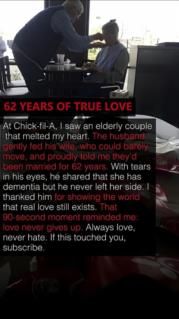 At Chick-fil-A, I saw an elderly couple that melted my heart. The husband gently fed his wife, who could barely move, and proudly told me they’d been married for 62 years. With tears in his eyes, he shared that she has dementia but he never left her side. I thanked him for showing the world that real love still exists. That 90-second moment reminded me: love never gives up. Always love, never hate. If this touched you, subscribe.