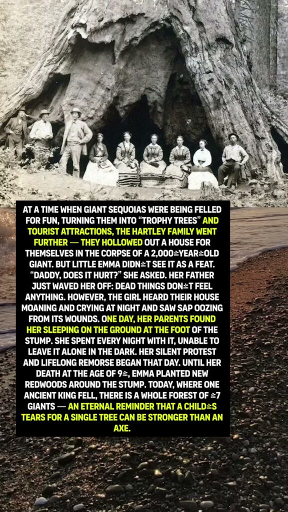 AT A TIME WHEN GIANT SEQUOIAS WERE BEING FELLED FOR FUN, TURNING THEM INTO “TROPHY TREES” AND TOURIST ATTRACTIONS, THE HARTLEY FAMILY WENT FURTHER — THEY HOLLOWED OUT A HOUSE FOR THEMSELVES IN THE CORPSE OF A 2,000+ YEAR-OLD GIANT. BUT LITTLE EMMA DIDN’T SEE IT AS A FEAT. “DADDY, DOES IT HURT?” SHE ASKED. HER FATHER JUST WAVED HER OFF: DEAD THINGS DON’T FEEL ANYTHING. HOWEVER, THE GIRL HEARD THEIR HOUSE MOANING AND CRYING AT NIGHT AND STARTED DOZING OFF IN THE WOODS ONE DAY. HER FAMILY FOUND HER SLEEPING ON THE GROUND AT THE FOOT OF THE STUMP. SHE SPENT EVERY NIGHT THERE AFTERWARDS UNTIL SOMEONE TOOK HER AWAY. HER PA SAID HE NEVER SAW HER SMILE AGAIN. THAT PAIN, UNTIL HER DEATH AT THE AGE OF 95, EMMA PLANTED NEW REDWOODS AROUND THE STUMP. TODAY, WHEN ONE ANCIENT KING FELL, THERE IS A WHOLE FOREST OF 7 OTHERS — AN ETERNAL REMINDER THAT CHILDREN’S TEARS FOR A SINGLE TREE CAN BE STRONGER THAN AN AXE.