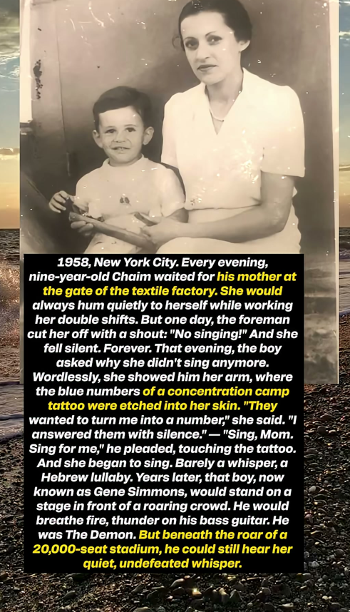 That boy would grow up to become Gene Simmons, co-founder of the rock band KISS. On stage, he became a fire-breathing icon—boots, makeup, thunderous riffs. But beneath the spectacle was a son who remembered his mother’s silence. Her stolen songs. Her resilience.