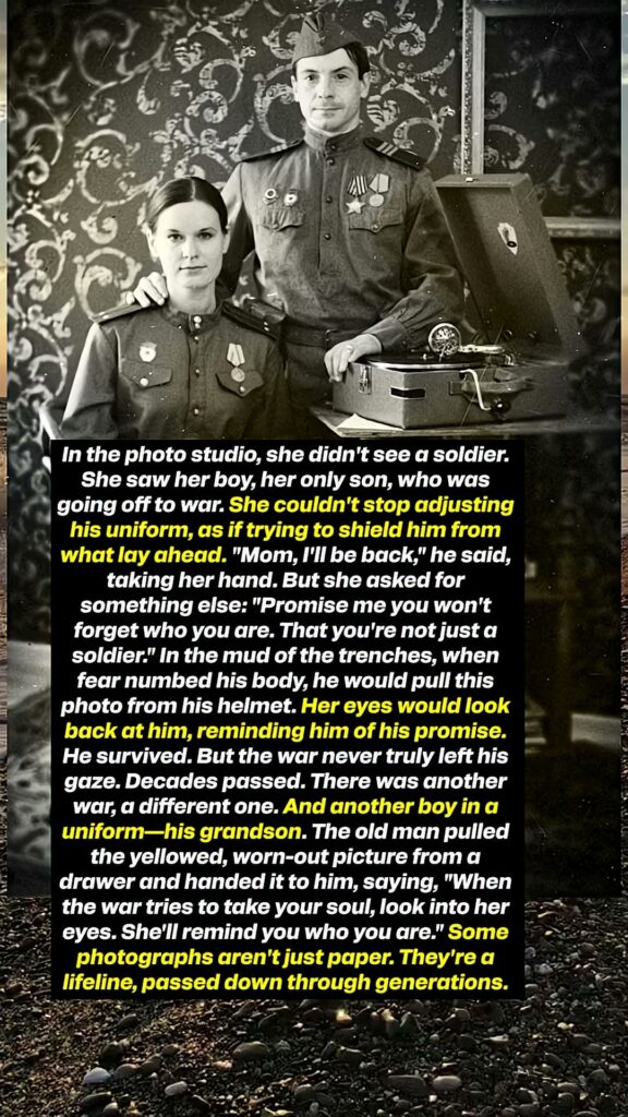 “In the photo studio, she didn’t see a soldier. She saw her boy, her only son, who was going off to war. She couldn’t stop adjusting his uniform, as if trying to shield him from what lay ahead. ‘Mom, I’ll be back,’ he said, taking her hand. But she would ask something else: ‘Promise me you won’t forget who you are. That you’re not just a soldier.’ In the mud of the trenches, when he remembered his mother, he would pull this photo out from his helmet. Her eyes would look back at him, reminding him of his promise. He survived. But the war would never lift its gaze. Decades passed. There was another war, a different one. And another boy in a uniform—his grandson. The grandmother pulled out the yellowed, worn-out picture from a drawer and handed it to him, saying, ‘When you’re scared, take your soul, look into her eyes. She’ll remind you who you are.’ Some photographs aren’t just paper. They’re a lifeline, passed down through generations.”
