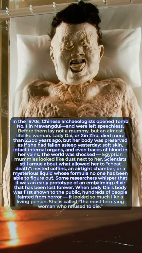 “In the 1970s, Chinese archaeologists opened Tomb No. 1 in Mawangdui—and were left speechless. Before them lay not a mummy, but an almost lifelike woman. Lady Dai, or Xin Zhui, died more than 2,200 years ago, but her body was preserved as if she had fallen asleep yesterday: soft skin, intact internal organs, and even traces of blood in her veins. The coffin was soaked—Egyptian mummies lacked fluid when scientists got to them. Scientists still argue about what allowed her to ‘cheat death’s ire.’ The fluids, the coffin, the chamber, or a mysterious liquid whose formula no one has been able to figure out. Some researchers whisper that she is an early prototype of an embalming elixir that has been lost forever. When Lady Dai’s body was first shown to the public, hundreds of people fainted from horror—it looked so much like a living person. She is called ‘the most terrifying woman who refused to die.'”