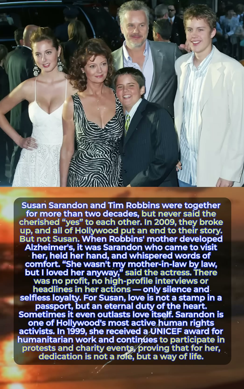Years after their breakup, when Tim Robbins’ mother was diagnosed with Alzheimer’s, it was Sarandon who quietly visited her. She held her hand, whispered comfort, and stayed present—not for headlines, but for heart. “She wasn’t my mother-in-law by law,” Sarandon said, “but I loved her anyway.”
