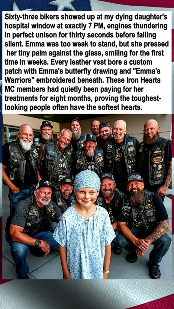 “Sixty-three bikers showed up at my dying daughter’s hospital window at exactly 7 PM, engines thundering in perfect unison for thirty seconds before falling silent. Emma was too weak to stand, but she pressed her tiny palm against the glass, smiling for the first time in weeks. Every leather vest bore a custom patch with Emma’s butterfly drawing and ‘Emma’s Warriors’ embroidered beneath. These Iron Hearts MC members had quietly been paying for her treatments for eight months, proving the toughest-looking people often have the softest hearts.”