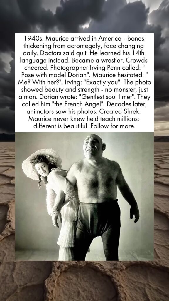 1940s. Maurice arrived in America — bones thickening from acromegaly, face changing daily. Doctors said quit. He learned his 14th language instead. Became a wrestler. Crowds cheered. Photographer Irving Penn called: “Pose with model Dorian.” Maurice hesitated: “Me? With her?” Irving: “Exactly you.” The photo showed beauty and strength — no monster, just a man. Dorian wrote: “Gentlest soul I met.” They called him “the French Angel.” Decades later, animators saw his photos. Created Shrek. Maurice never knew he’d teach millions: different is beautiful. Follow for more.