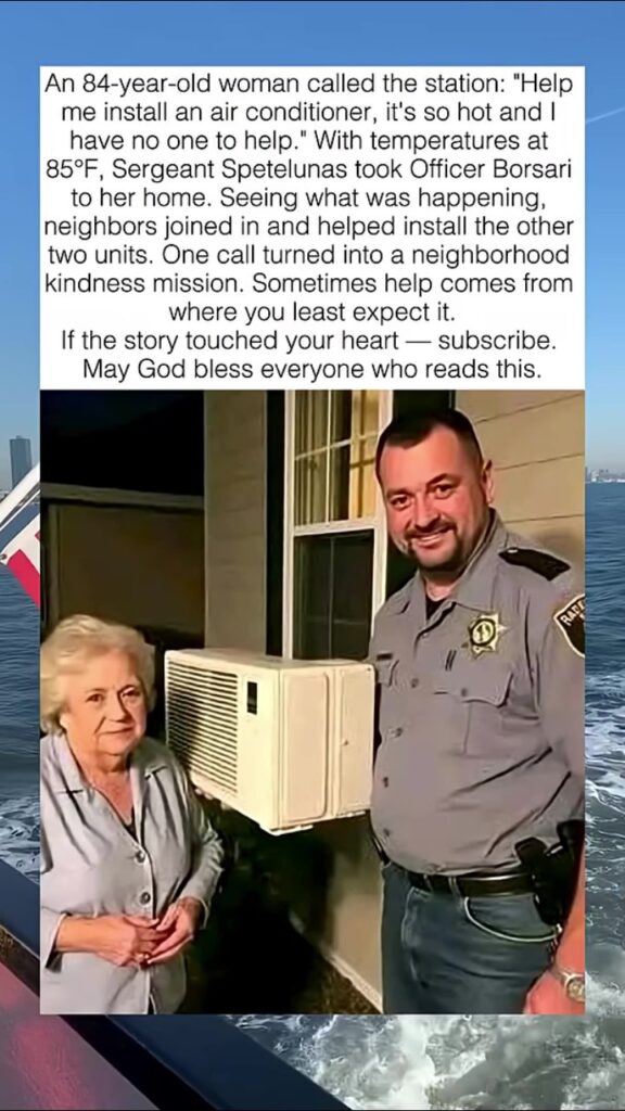 An 84-year-old woman called the station: “Help me install an air conditioner, it’s so hot and I have no one to help.” With temperatures at 85°F, Sergeant Spetelunas took Officer Borsari to her home. Seeing what was happening, neighbors joined in and helped install the other two units. One call turned into a neighborhood kindness mission. Sometimes help comes from where you least expect it. If the story touched your heart — subscribe. May God bless everyone who reads this.