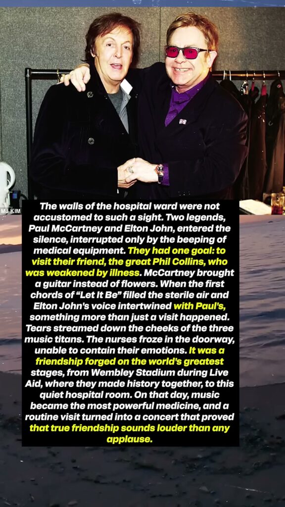 The walls of the hospital ward were not accustomed to such a sight. Two legends, Paul McCartney and Elton John, entered the silence, interrupted only by the beeping of medical equipment. They had one goal: to visit their friend, the great Phil Collins, who was weakened by illness. McCartney brought a guitar instead of flowers. When the first chords of “Let It Be” filled the sterile air and Elton John’s voice intertwined with Paul’s, something more than just a visit happened. Tears streamed down the cheeks of the three music titans. The nurses froze in the doorway, unable to contain their emotions. It was a friendship forged on the world’s greatest stages, from Wembley Stadium during Live Aid, where they made history together, to this quiet hospital room. On that day, music became the most powerful medicine, and a routine visit turned into a concert that proved that true friendship sounds louder than any applause.