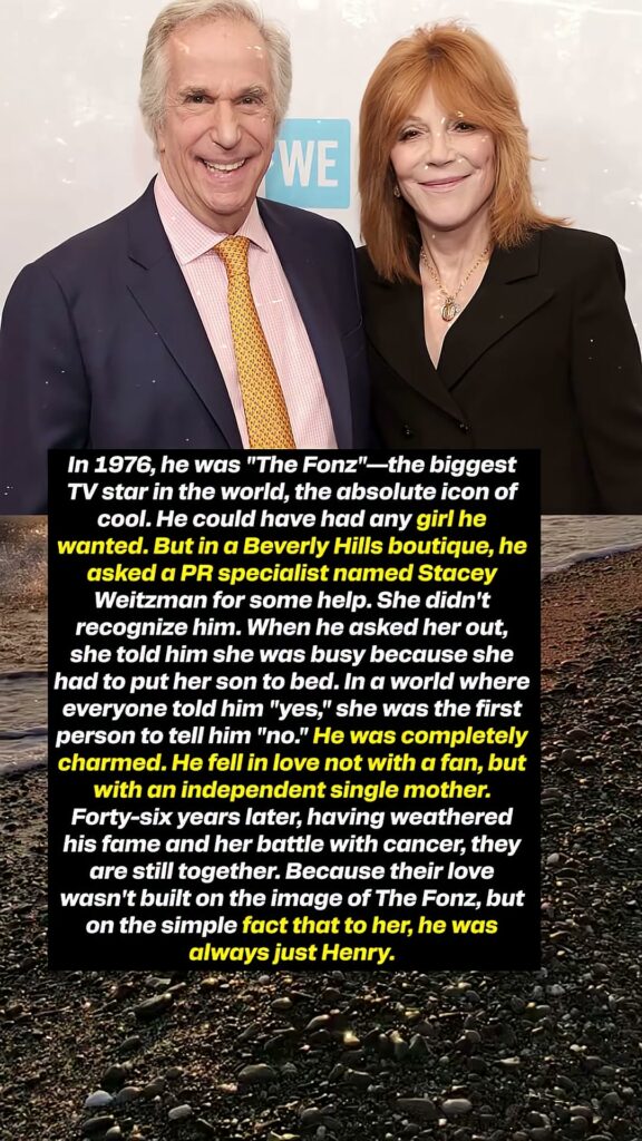 In 1976, he was “The Fonz”—the biggest TV star in the world, the absolute icon of cool. He could have had any girl he wanted. But in a Beverly Hills boutique, he asked a PR specialist named Stacey Weitzman for some help. She didn’t recognize him. When he asked her out, she told him she was busy because she had to put her son to bed. In a world where everyone told him “yes,” she was the first person to tell him “no.” He was completely charmed. He fell in love not with a fan, but with an independent single mother. Forty-six years later, having weathered his fame and her battle with cancer, they are still together. Because their love wasn’t built on the image of The Fonz, but on the simple fact that to her, he was always just Henry.