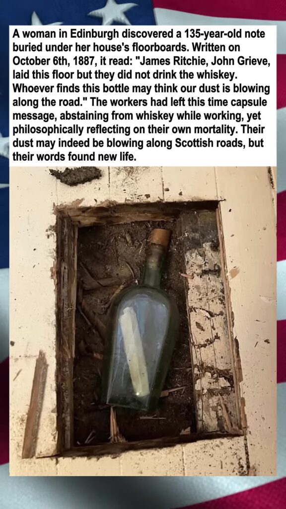 A woman in Edinburgh discovered a 135-year-old note buried under her house’s floorboards. Written on October 6th, 1887, it read: “James Ritchie, John Grieve, laid this floor but they did not drink the whiskey. Whoever finds this bottle may think our dust is blowing along the road.” The workers had left this time capsule message, abstaining from whiskey while working, yet philosophically reflecting on their own mortality. Their dust may indeed be blowing along Scottish roads, but their words found new life.
