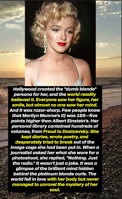 Hollywood created the “dumb blonde” persona for her, and the world readily believed it. Everyone saw her figure, her smile, but almost no one saw her mind. And it was razor-sharp. Few people know that Marilyn Monroe’s IQ was 165—five points higher than Albert Einstein’s. Her personal library contained hundreds of volumes, from Freud to Dostoevsky. She kept diaries, wrote poetry, and desperately tried to break out of the image cage she had been put in. When a journalist asked her what she wore for a photoshoot, she replied, “Nothing. Just the radio.” It wasn’t just a joke. It was a glimpse of the brilliant mind hidden behind the platinum blonde curls. The world fell in love with her body but never managed to unravel the mystery of her soul.