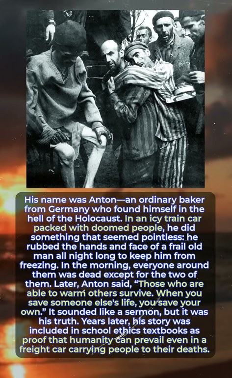 His name was Anton—an ordinary baker from Germany who found himself in the hell of the Holocaust. In an icy train car packed with doomed people, he did something that seemed pointless: he rubbed the hands and face of a frail old man all night long to keep him from freezing. In the morning, everyone around them was dead except for the two of them. Later, Anton said, “Those who are able to warm others survive. When you save someone else’s life, you save your own.” It sounded like a sermon, but it was his truth. Years later, his story was included in school ethics textbooks as proof that humanity can prevail even in a freight car carrying people to their deaths.