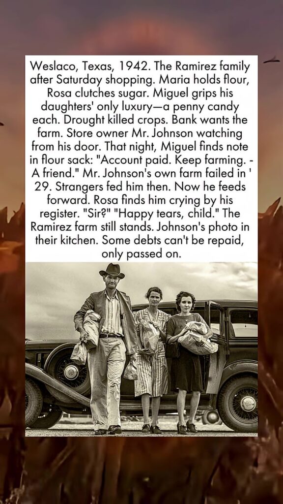 Weslaco, Texas, 1942. The Ramirez family after Saturday shopping. Maria holds flour, Rosa clutches sugar. Miguel grips his daughters’ only luxury—a penny candy each. Drought killed crops. Bank wants the farm. Store owner Mr. Johnson watching from his door. That night, Miguel finds note in flour sack: “Account paid. Keep farming. – A friend.” Mr. Johnson’s own farm failed in ’29. Strangers fed him then. Now he feeds forward. Rosa finds him crying by his register. “Sir?” “Happy tears, child.” The Ramirez farm still stands. Johnson’s photo in their kitchen. Some debts can’t be repaid, only passed on.