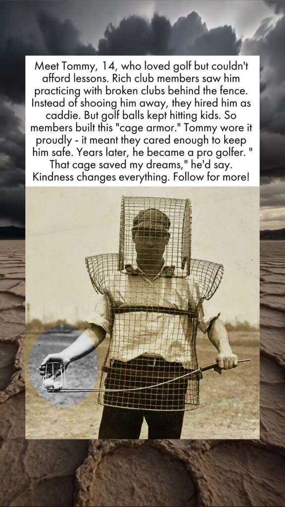 Meet Tommy, 14, who loved golf but couldn’t afford lessons. Rich club members saw him practicing with broken clubs behind the fence. Instead of shooing him away, they hired him as caddie. But golf balls kept hitting kids. So members built this “cage armor.” Tommy wore it proudly – it meant they cared enough to keep him safe. Years later, he became a pro golfer. “That cage saved my dreams,” he’d say. Kindness changes everything. Follow for more!