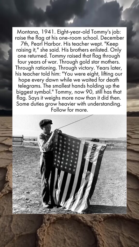Montana, 1941. Eight-year-old Tommy’s job: raise the flag at his one-room school. December 7th, Pearl Harbor. His teacher wept. “Keep raising it,” she said. His brothers enlisted. Only one returned. Tommy raised that flag through four years of war. Through gold star mothers. Through rationing. Through victory. Years later, his teacher told him: “You were eight, lifting our hope every dawn while we waited for death telegrams. The smallest hands holding up the biggest symbol.” Tommy, now 90, still has that flag. Says it weighs more now than it did then. Some duties grow heavier with understanding.