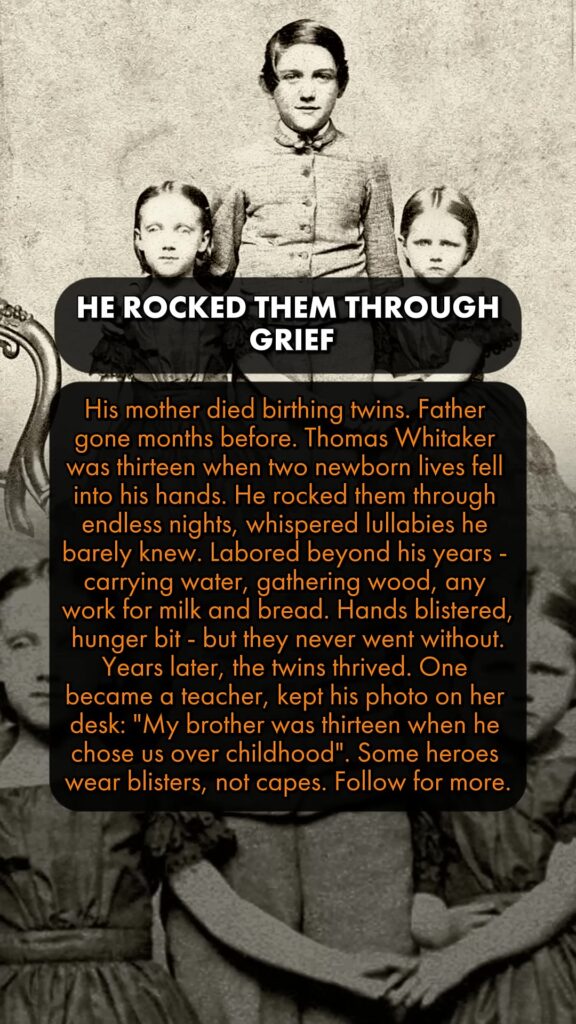 His mother died birthing twins. Father gone months before. Thomas Whitaker was thirteen when two newborn lives fell into his hands. He rocked them through endless nights, whispered lullabies he barely knew. Labored beyond his years – carrying water, gathering wood, any work for milk and bread. Hands blistered, hunger bit – but they never went without. Years later, the twins thrived. One became a teacher, kept his photo on her desk: “My brother was thirteen when he chose us over childhood”. Some heroes wear blisters, not capes.