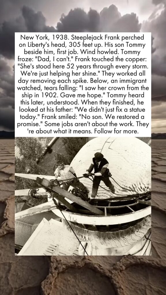New York, 1938. Steeplejack Frank perched on Liberty’s head, 305 feet up. His son Tommy beside him, first job. Wind howled. Tommy froze: “Dad, I can’t.” Frank touched the copper: “She’s stood here 52 years through every storm. We’re just helping her shine.” They worked all day removing each spike. Below, an immigrant watched, tears falling: “I saw her crown from the ship in 1902. Gave me hope.” Tommy heard this later, understood. When they finished, he looked at his father: “We didn’t just fix a statue today.” Frank smiled: “No son. We restored a promise.” Some jobs aren’t about the work. They’re about what it means.