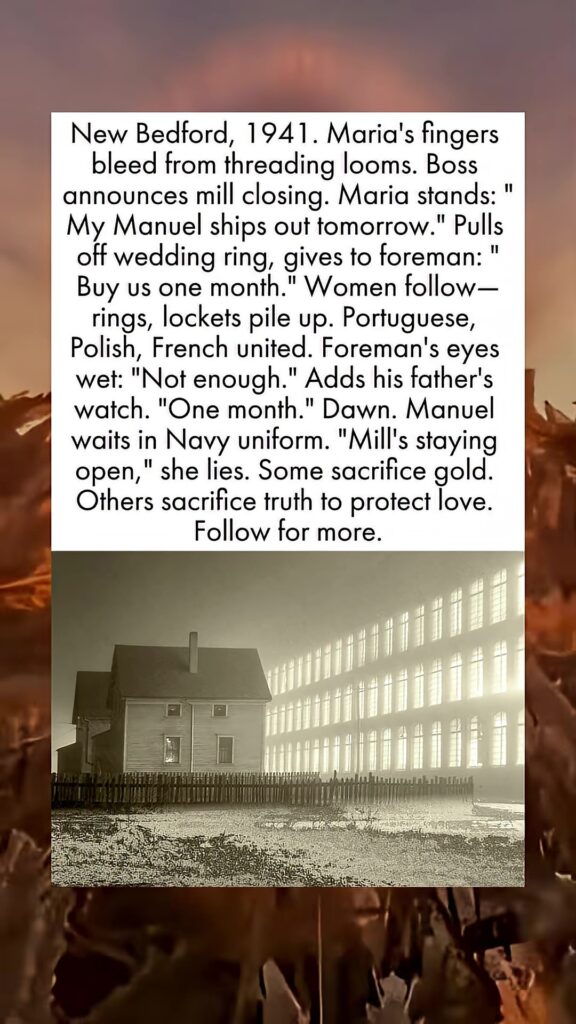New Bedford, 1941. Maria’s fingers bleed from threading looms. Boss announces mill closing. Maria stands: “My Manuel ships out tomorrow.” Pulls off wedding ring, gives to foreman: “Buy us one month.” Women follow—rings, lockets pile up. Portuguese, Polish, French united. Foreman’s eyes wet: “Not enough.” Adds his father’s watch. “One month.” Dawn. Manuel waits in Navy uniform. “Mill’s staying open,” she lies. Some sacrifice gold. Others sacrifice truth to protect love.