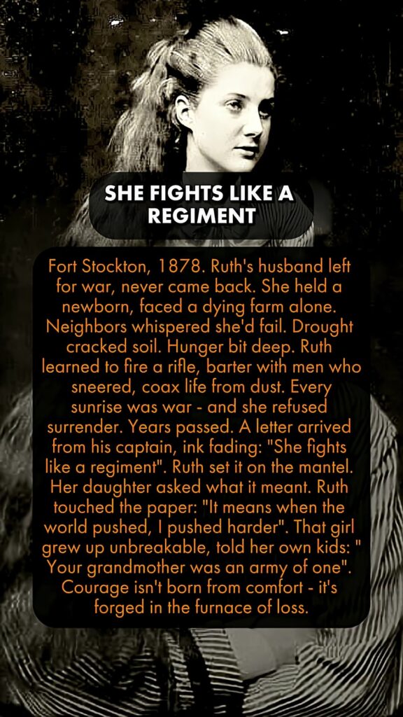 Fort Stockton, 1878. Ruth’s husband left for war, never came back. She held a newborn, faced a dying farm alone. Neighbors whispered she’d fail. Drought cracked soil. Hunger bit deep. Ruth learned to fire a rifle, barter with men who sneered, coax life from dust. Every sunrise was war – and she refused surrender. Years passed. A letter arrived from his captain, ink fading: “She fights like a regiment”. Ruth set it on the mantel. Her daughter asked what it meant. Ruth touched the paper: “It means when the world pushed, I pushed harder”. That girl grew up unbreakable, told her own kids: “Your grandmother was an army of one”. Courage isn’t born from comfort – it’s forged in the furnace of loss.