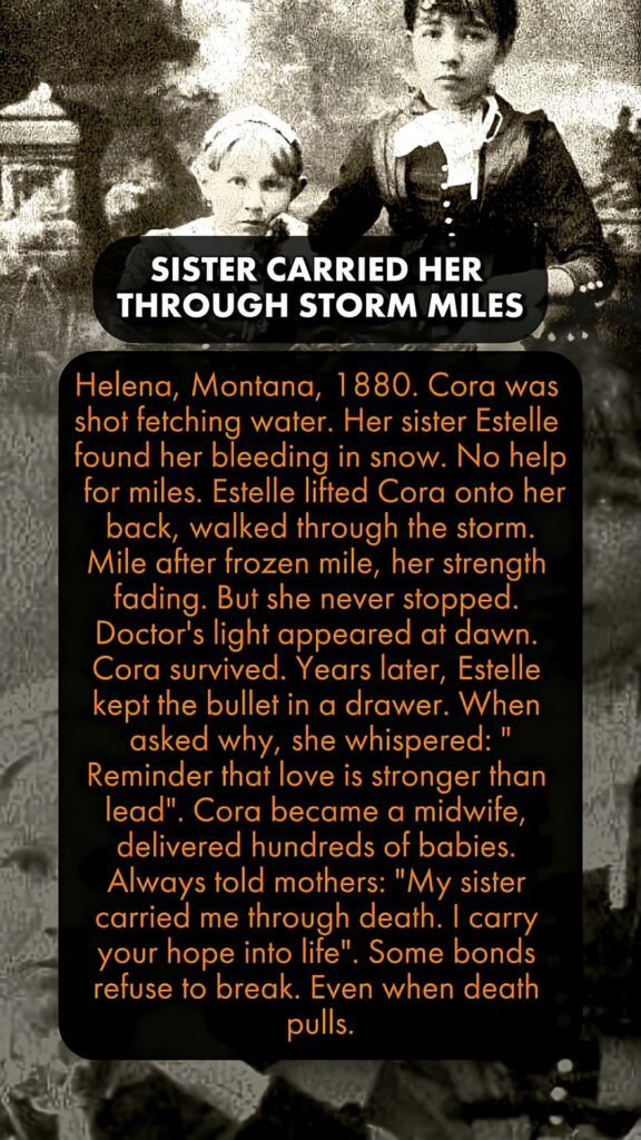 Helena, Montana, 1880. Cora was shot fetching water. Her sister Estelle found her bleeding in snow. No help for miles. Estelle lifted Cora onto her back, walked through the storm. Mile after frozen mile, her strength fading. But she never stopped. Doctor’s light appeared at dawn. Cora survived. Years later, Estelle kept the bullet in a drawer. When asked why, she whispered: “Reminder that love is stronger than lead”. Cora became a midwife, delivered hundreds of babies. Always told mothers: “My sister carried me through death. I carry your hope into life”. Some bonds refuse to break. Even when death pulls.