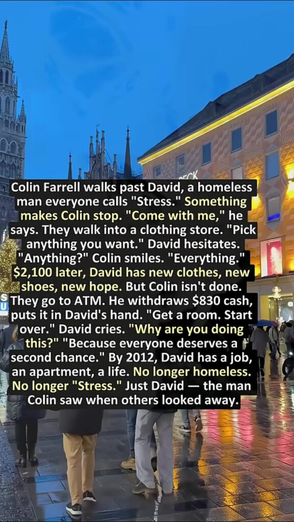 Colin Farrell walks past David, a homeless man everyone calls “Stress.” Something makes Colin stop. “Come with me,” he says. They walk into a clothing store. “Pick anything you want.” David hesitates. “Anything?” Colin smiles. “Everything.” $2,100 later, David has new clothes, new shoes, new hope. But Colin isn’t done. They go to ATM. He withdraws $830 cash, puts it in David’s hand. “Get a room. Start over.” David cries. “Why are you doing this?” “Because everyone deserves a second chance.” By 2012, David has a job, an apartment, a life. No longer homeless. No longer “Stress.” Just David — the man Colin saw when others looked away.