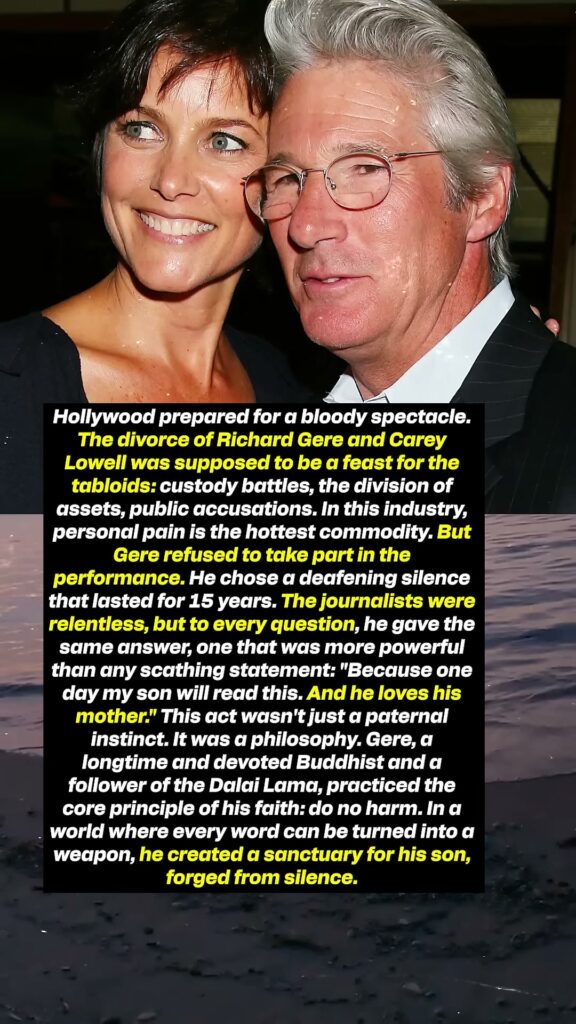 Hollywood prepared for a bloody spectacle. The divorce of Richard Gere and Carey Lowell was supposed to be a feast for the tabloids: custody battles, the division of assets, public accusations. In this industry, personal pain is the hottest commodity. But Gere refused to take part in the performance. He chose a deafening silence that lasted for 15 years. The journalists were relentless, but to every question, he gave the same answer, one that was more powerful than any scathing statement: “Because one day my son will read this. And he loves his mother.” This act wasn’t just a paternal instinct. It was a philosophy. Gere, a longtime and devoted Buddhist and a follower of the Dalai Lama, practiced the core principle of his faith: do no harm. In a world where every word can be turned into a weapon, he created a sanctuary for his son, forged from silence.