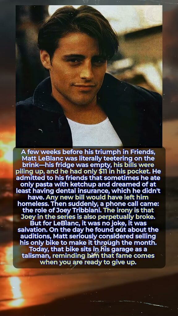 A few weeks before his triumph in Friends, Matt LeBlanc was literally teetering on the brink—his fridge was empty, his bills were piling up, and he had only $11 in his pocket. He admitted to his friends that sometimes he ate only pasta with ketchup and dreamed of at least having dental insurance, which he didn’t have. Any new bill would have left him homeless. Then suddenly, a phone call came: the role of Joey Tribbiani. The irony is that Joey in the series is also perpetually broke. But for LeBlanc, it was no joke; it was salvation. On the day he found out about the auditions, Matt seriously considered selling his only bike to make it through the month. Today, that bike sits in his garage as a talisman, reminding him that fame comes when you are ready to give up.