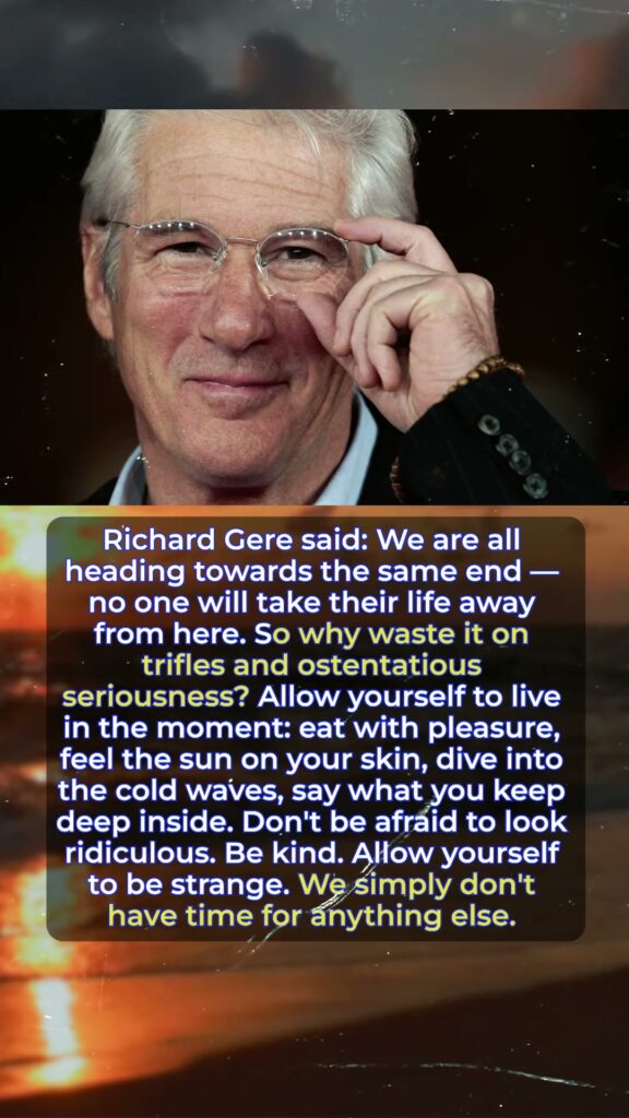 Richard Gere said: We are all heading towards the same end — no one will take their life away from here. So why waste it on trifles and ostentatious seriousness? Allow yourself to live in the moment: eat with pleasure, feel the sun on your skin, dive into the cold waves, say what you keep deep inside. Don’t be afraid to look ridiculous. Be kind. Allow yourself to be strange. We simply don’t have time for anything else.