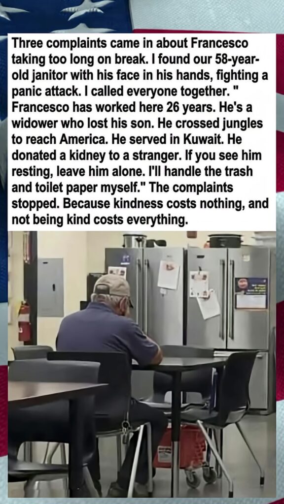 I called everyone together. “Francesco has worked here 26 years. He’s a widower who lost his son. He crossed jungles to reach America. He served in Kuwait. He donated a kidney to a stranger.