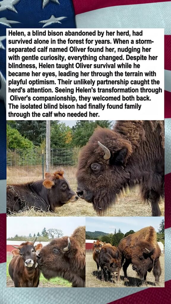 Helen, a blind bison abandoned by her herd, had survived alone in the forest for years. When a storm-separated calf named Oliver found her, nudging her with gentle curiosity, everything changed.