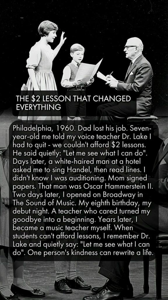 Philadelphia, 1960. I was seven. My dad had just lost his job. I told my voice teacher, Dr. Lake, I had to quit—we couldn’t afford the $2 lessons anymore.