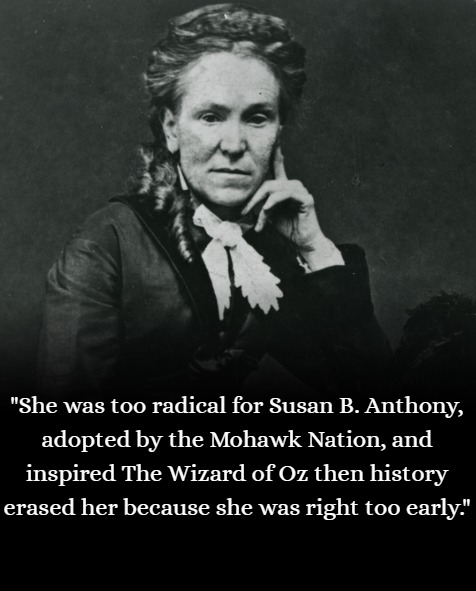 was erased from history. And named for that erasure. In 1995, Gage was inducted into the National Women’s Hall of Fame. Her Fayetteville home is now a museum and center for social justice dialogue. Her gravestone in Fayetteville Cemetery carries the words she lived by: “There is a word sweeter than Mother, Home or Heaven; that word is Liberty. “The Legacy Matilda Joslyn Gage argued that true freedom meant examining every structure that held women downânot just the denial of the vote, but the theology that taught women’s inferiority as sacred truth. She honored Indigenous women as models of political equality when white society called them savages. She defended women accused of witchcraft across centuries of history, insisting they were not evil but educated, not dangerous but daring. She was not erased because she was unimportant. She was erased because she was right too earlyâand too completely. The suffrage movement eventually won the vote. But Gage had warned that voting alone would never be enough. That any movement willing to compromise with the forces of oppression would only win partial freedom. She who holds the sky saw further than the vote. And history is finally beginning to see her. She co-founded the suffrage movement with Susan B. Anthony. She was adopted by the Mohawk Nation as “She who holds the sky. “She inspired The Wizard of Oz. She documented how women’s work is erasedâthen was erased herself. The phenomenon of women being denied credit is literally named after her: the “Matilda effect. “And for a century, most of us never knew her name. Share this. Remember her. Say her name: Matilda Joslyn Gage.