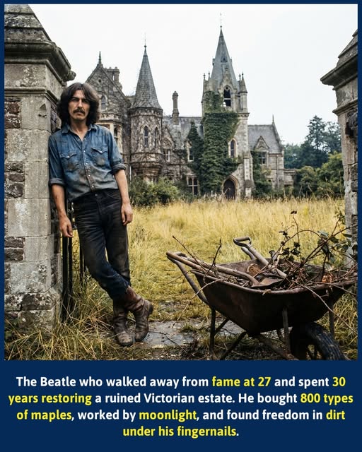 1970. George Harrison stands at the gates of Friar Park, staring at what everyone else calls a catastrophe. The Victorian mansion is rotting. Grass pushes through floorboards inside. The estate’s gardens, once the pride of England, have gone feral. Collapsed greenhouses. Buried grottoes. Pathways strangled by decades of neglect. He’s 27 years old. The Beatles just ended. He could go anywhere, do anything. The world is waiting for his next move. He buys the wreck and decides to dig in the dirt. Not as a weekend hobby. As a life. He hires ten gardeners and works alongside them, dawn to midnight, covered in soil. His sister-in-law takes one look at the estate and asks what he’s thinking. George doesn’t try to explain. He just keeps digging.