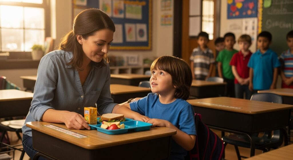 My name is Allison, I’m 32 years old, and I live in Topeka, Kansas. I found out by accident, the kind that changes how you see your own life in hindsight. It was parent-teacher conference night, and I was already nervous. My son, Ethan, is seven—quiet, gentle, and the kind of kid teachers describe as “no trouble at all.” I always worry that means he’s invisible. His teacher, Mrs. Collins, smiled warmly as we sat down. We talked about reading progress, math skills, and how kind Ethan was to other kids. Then she hesitated, fingers folding together like she was choosing her words carefully. “I want to ask something,” she said. “Is everything okay at home… with meals?” My stomach tightened. I told her yes. I work two jobs. Things are tight, but I budget carefully. We always have dinner. Breakfast, too. Lunch money was… complicated. Some weeks I sent it. Some weeks I meant to and forgot. I assumed the school would notify me if there was an issue. She nodded slowly, then said, “I thought so. I just wanted to make sure.” I didn’t think much of it until she added, quietly, “Ethan hasn’t gone without lunch.”